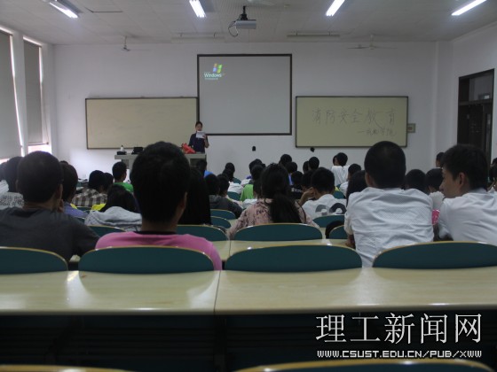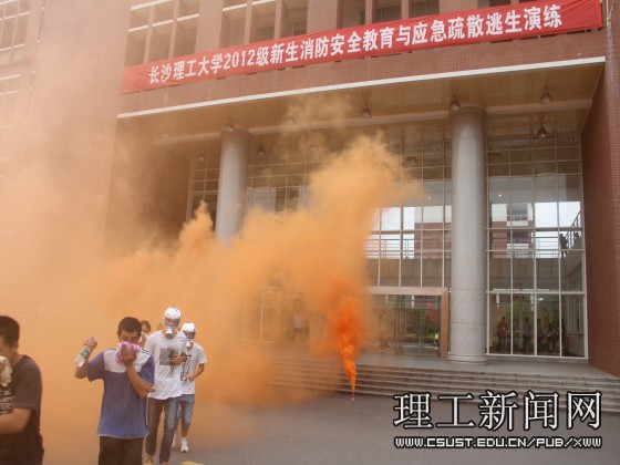 活动共分三部分,一是各学院辅导员老师在多媒体教室根据消防教育宣讲提纲对新生进行消防安全专题教育;二是组织收看《全民消防、生命至上》消防安全宣传片。下午3:40,在活动现场总指挥下达“应急疏散逃生演练现在开始”的指令后,位于各楼层的保卫人员和辅导员老师迅速组织有序学生撤离教室,并在一楼大厅和出口处燃放烟幕弹,一些同学带上了防毒面具,或用毛巾、衣物等捂住口鼻,从烟幕中穿过,迅速撤离到教学楼外的广场上。