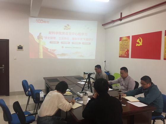 3月29日下午2:30,材料学院党总支在新能源大楼1-305召开了党总支中心组“学史明理,立足岗位,履职尽责”专题研讨会,会议由院党总支书记张国强主持,学院领导班子参加了会议。