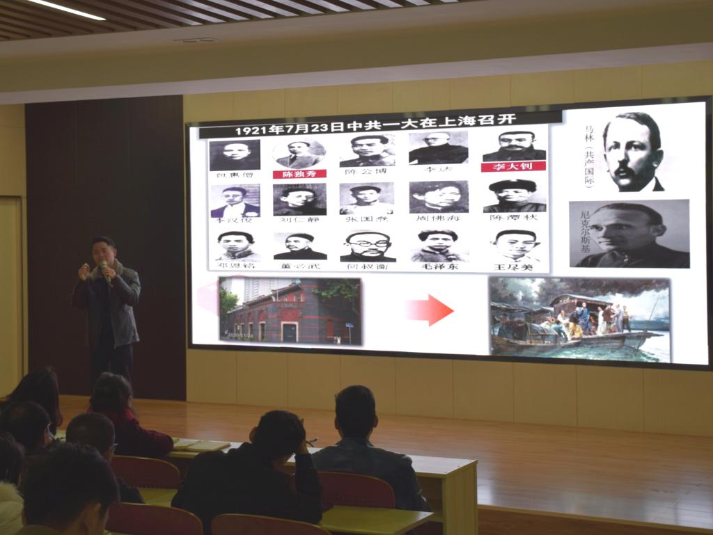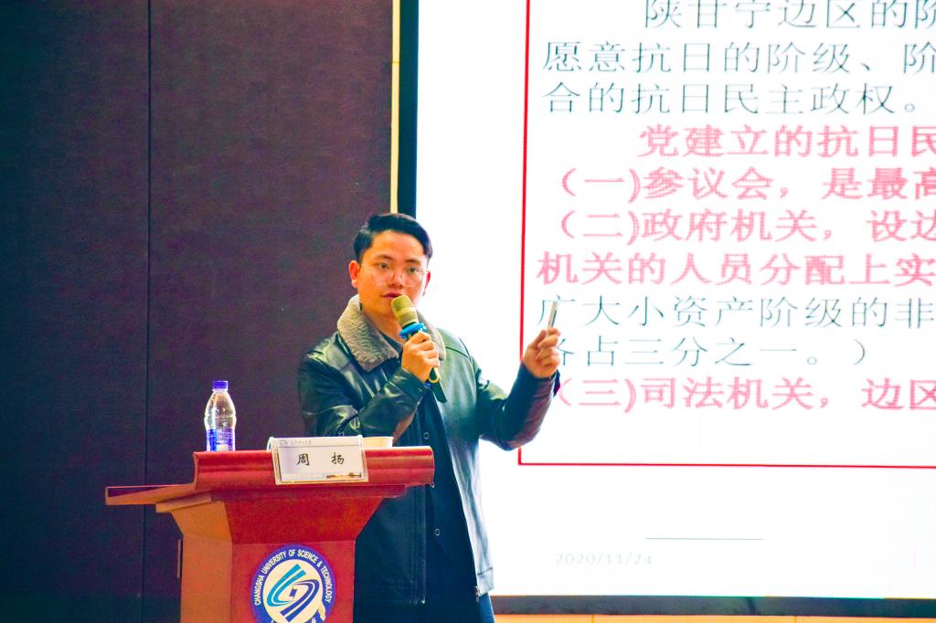 周扬以时间为线索,从党的创建与大革命时期参与建政的尝试、土地革命时期建立局部政权的曲折探索、全民族抗战时期抗日民主政权的发展壮大和解放战争时期四部分讲述,通过详实的史料、生动的细节,并辅以大量的珍贵历史资料,穿插历史故事和人物趣事,讲到最早一批共产党员人物经历、分析毛泽东不同时期的诗词作品以及解读当时中国的形势处境,让与会师生深刻的认识到党史是一部中国共产党从无到有、从小到大、从弱到强、不断从胜利走向新的胜利的伟大斗争史。最后周扬结合中国共产党夺取全国政权历程的启示,建议师生们用好统一战线这个重要法宝,将其融汇贯通运用在学习工作中。