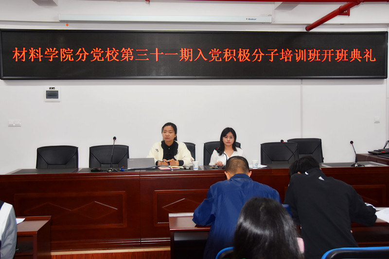 4月20号晚七点,材料学院第三十一期入党积极分子培训班开班典礼于新能源大楼302召开,由1704的樊雨佳主持,同时出席此次典礼的还有院党委副书记唐青,材料学院学生党建专干谢易真,全体入党积极分子出席。