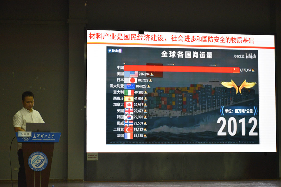 毛卫国院长从“21世纪最热门的十大行业出发,直接引出了新材料在新世纪的地位之重要,然后通过结合历史,重点讲述了新材料是材料工业发展的先导,是重要的战略性新兴产业。尤以中华人民共和国成立后至近几十年来我国的海运量、高铁总里程的世界排名变化数据视频,结合我国被“卡脖子”的35项关键技术,更加显著的表现了材料发展的重要性。毛院长还详细地介绍了材料学院的师资力量、实验设备、科研成果、就业前景、专业设置、创新人才培养体系等,使本科新生加深了对材料学院以及材料专业的了解。最后毛院长希望新生们要勤奋学习,兼顾学习与生活,多走进实验室,多参加科创比赛,为国家未来的新材料发展作出巨大贡献。