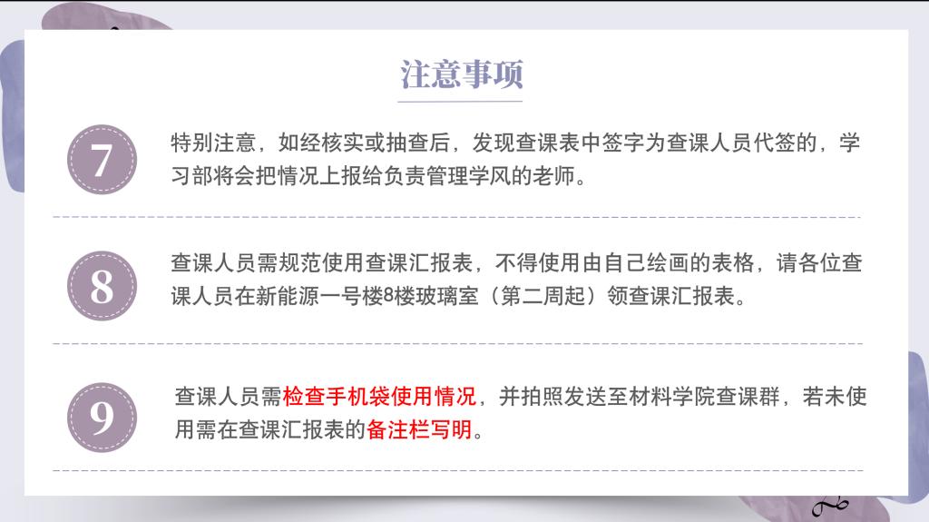 首先,杨静怡介绍了材料学院查课的目的。接着,她详细说明了查课流程和相关注意事项。随后,她重点讲解了各位查课人员需要谨记的查课注意事项。紧接着针对上述的阐述有疑问的查课人员连麦,开展提问环节,主持人杨静怡为其详细解答。最后,王志亮老师总结发言,再次强调查课制度的重要性同时表达了对新任查课人员的期望与要求。