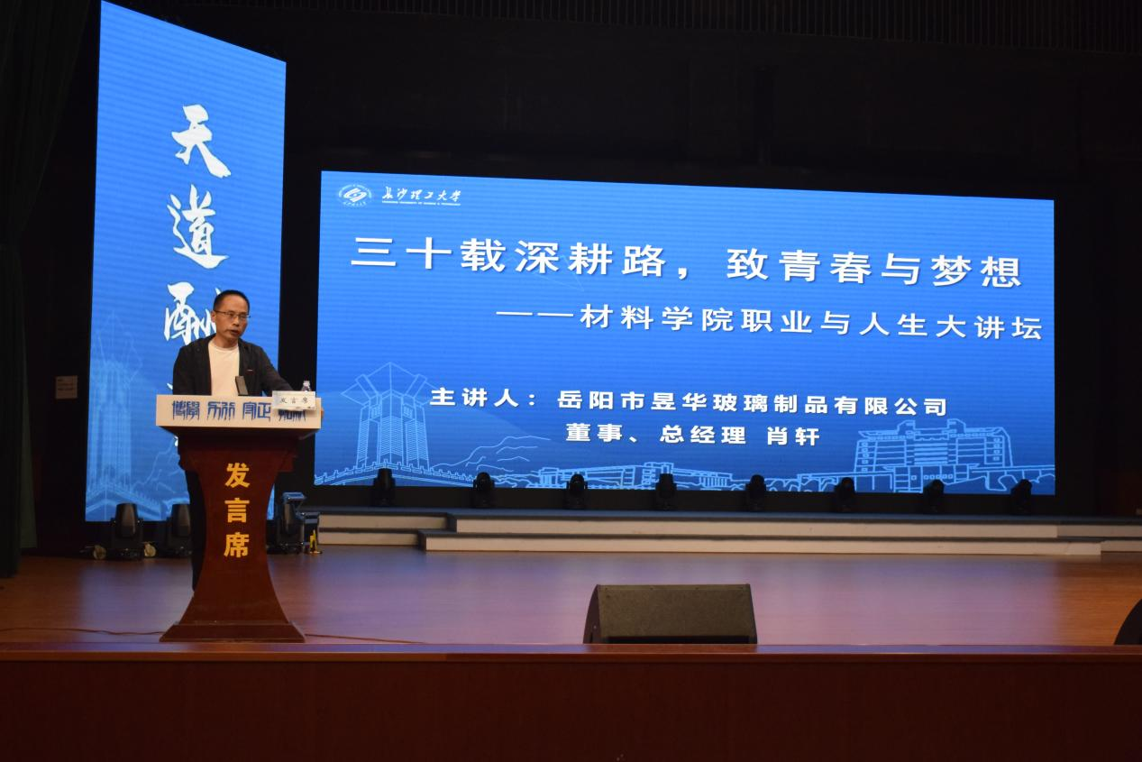 永利官网89届硅酸盐专业杰出校友,岳阳市昱华玻璃制品有限公司董事、总经理、高级工程师肖轩出席并作《三十载耕路 致青春与梦想》专题报告。