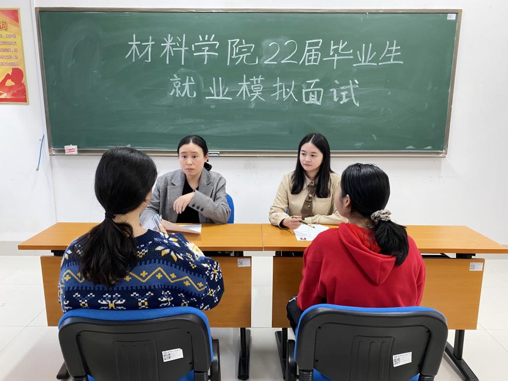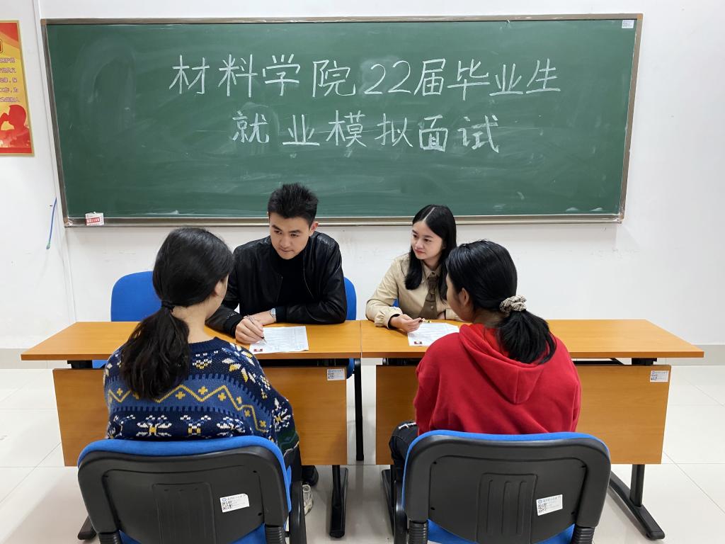11月2日下午,材料学院2022届毕业生就业模拟面试在新能源大楼303举办。学院党总支副书记陈华、辅导员谢易真、陈鑫林模拟公司HR,为学院就业困难的学生进行了模拟面试及就业指导。