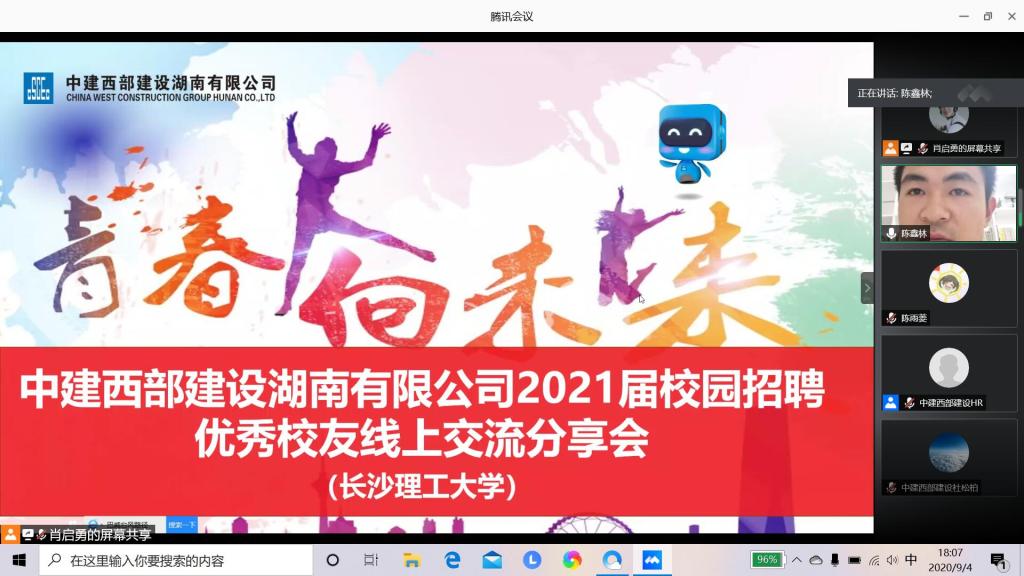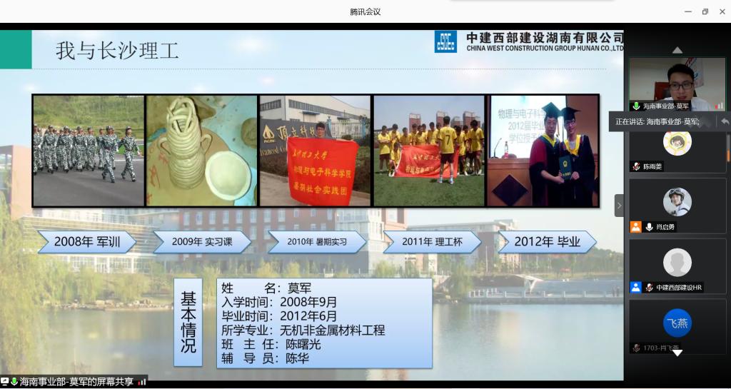 临近就业之际,为帮助毕业生了解企业,更好的做出职业选择,促进同学们的职业规划意识,9月4日,材料学院于腾讯会议举办了主题为勇往“职”前,对话校友——中建西部建设优秀校友线上交流会,这是材料学院生涯发展规划系列活动之一,院党总支副书记陈华、就业专干陈鑫林、中建西部建设湖南有限公司人力资源部相关领导及优秀校友莫军、邓怡帆、汪亮、聂涛出席会议,各年级学生均有参加。