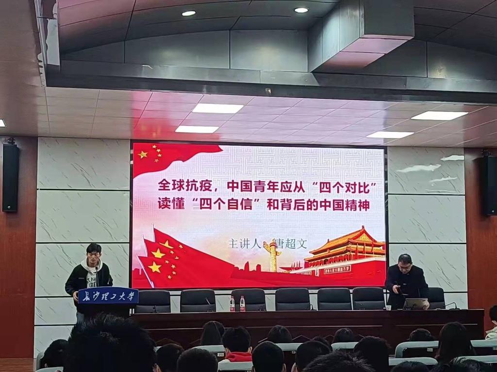唐超文以全球抗疫,中国青年应从“四个对比”读懂“四个自信”和战役背后的中国精神为主题,讲述通过人民为中心的发展理念、党领导一切的政治原则、问题倒逼改革的创新品质对比方向抉择来理解道路自信;通过总体安全观、开放发展理念、人类命运共同体理念对比执政方略来理解理论自信;通过政治制度优势、组织体制优势、民主机制优势对比治理模式来理解制度自信;通过坚守中华文化立场、不忘本来,面向未来,吸收外来文化对比精神塑造进而理解文化自信;并向同学们剖析了战役背后的中国精神,其包括:履职尽责,冲锋在前的奉献精神、众志成城,同舟共济的团结精神、自强不息,越挫越勇的奋斗精神、构建人类命运共同体担当精神。最后,唐超文强调要学会结合抗击疫情背后的中国精神从“四个对比”读懂“四个自信”,坚定理想信念。
