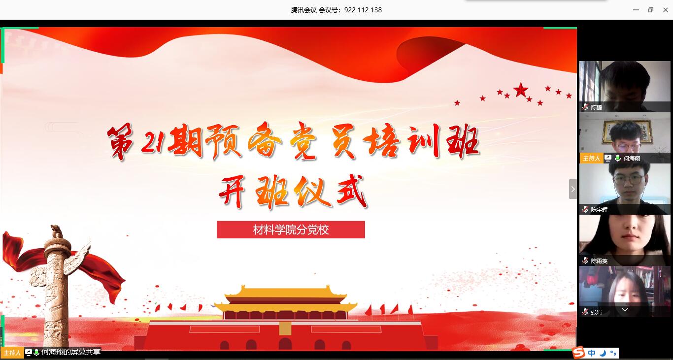 4月28日下午,材料学院第二十一期预备党员培训班开班典礼在“腾讯会议”线上举行。党建辅导员银波出席,全体学员参加,开班典礼由培训班负责人何海翔主持。
