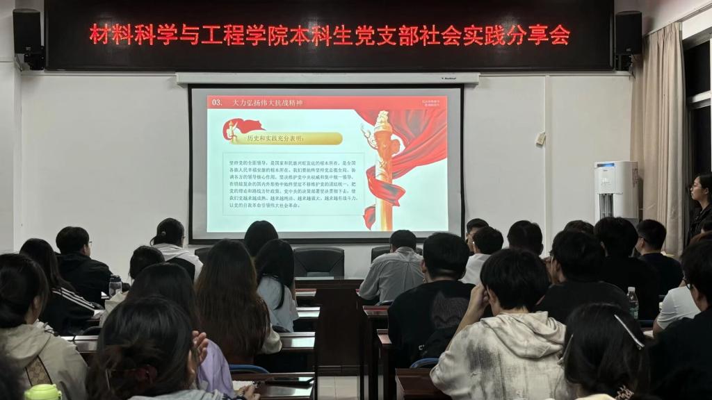 925日晚1900,材料科学与工程学院本科学生党支部在新能源大楼1908会议室举办忆抗战峥嵘,传红色薪火暑假社会实践分享会。学院全体本科生党员和入党积极分子代表分享实践成果,交流心得体会。学院党委副书记邵巧艳、党建辅导员谭方林出席本次活动。