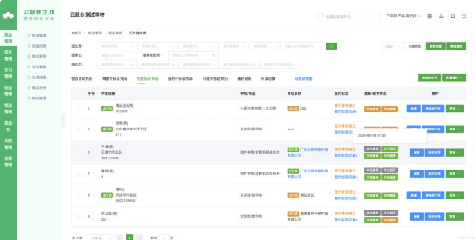 2)老师可实时查看单位盖章、学生签名状态、时间(绿色:代表已盖章,黄色:代表待盖章,灰色代表待其他签署方盖章);