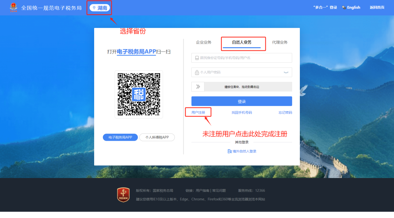 操作路径:通过电脑网页打开全国统一规范电子税务局,先完成自然人账户注册。注册完毕,登录地选择登记所在地对应【省份】,再选择【自然人业务】登录。