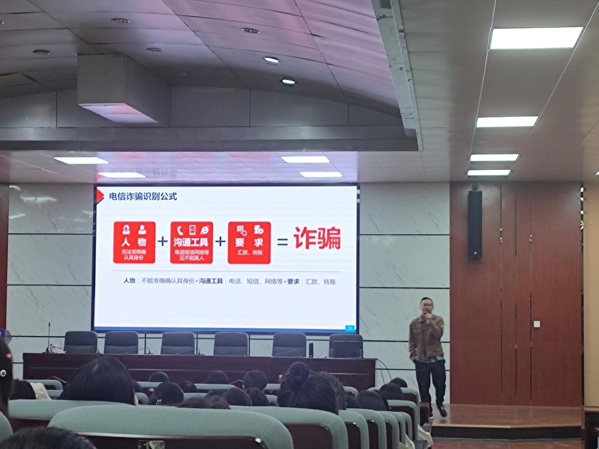 最后,宋老师介绍了多种常见骗术和相应的预防措施。他指出,防范电信诈骗,一是要警惕“熟人”网络借款;二是要远离网络刷单,做到不贪、不占、不转账,提高警惕之心,筑牢安全防线;三是要提高安全意识,保护好个人隐私、个人信息。(文/王幸 图/王幸 审核/申纯)