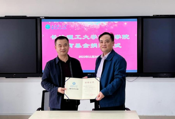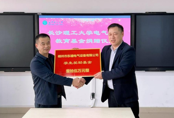 郴州市东塘电气设备有限公司向电气学院捐赠学生奖学金壹拾伍万元,设立“东塘电气专项奖学金”,用于奖励家庭经济困难、自强不息、品学兼优的大学生和学生干部。谭珍忠和伍接朝共同签订捐赠协议。任艮丰代表电气学院接受捐赠,伍接朝给企业颁发捐赠证书。