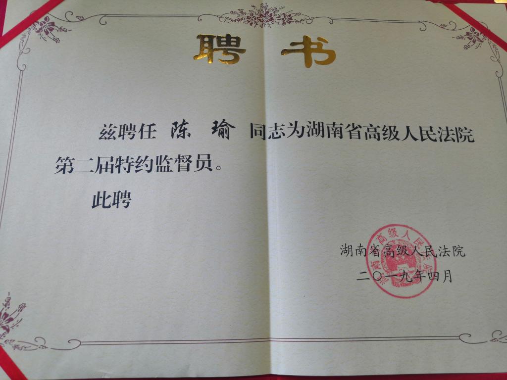 为认真落实中央和省委关于加强党外代表人士队伍建设的要求,加大优秀党外中青年代表人士的培养锻炼力度,经省委统战部、省高级人民法院联合考察,永利官网党外知识分子联谊会会长、国际学院院长、无党派人士陈瑜受聘为湖南省高级人民法院第二届特约监督员,聘期三年。
