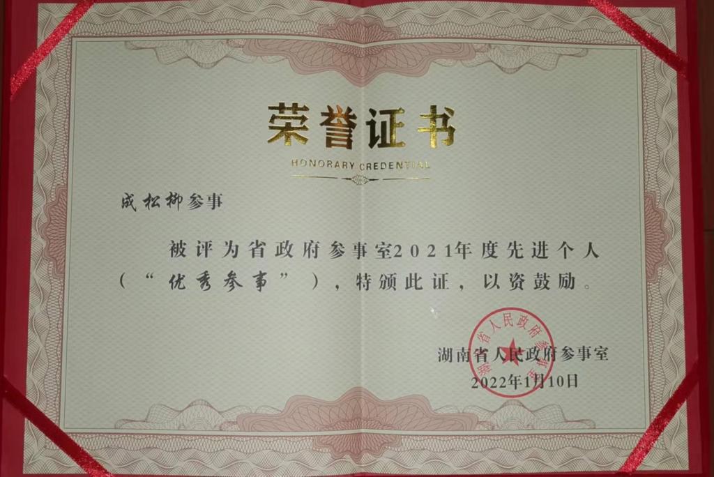 近日,湖南省人民政府参事室表彰了2021年度优秀参事,永利官网成松柳教授被评为省政府参事室2021年度先进个人(“优秀参事”)。