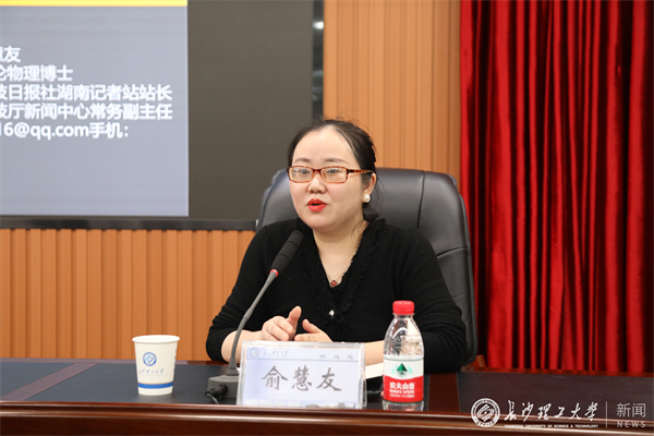 开班仪式结束后,《科技日报》湖南记者站站长、省科技厅新闻中心常务副主任俞慧友以《高校科技新闻的采写》为题做辅导报告。俞慧友结合工作实际,对比多篇报道的初稿、修改稿、见报稿,围绕科技工作会议及活动报道,科技专项、成果新闻报道,科普报道,科技人物写作进行了深入浅出的讲解,分享了个人的写作经验心得。她强调,科技新闻写作要找到新闻价值点,把握导向、客观表达,确保科技新闻的新闻性、科学性、通俗性和权威性;要主动把握社会热点和时间节点,注重回应关切关键问题;要加强科普,将晦涩难懂的专业术语“翻译”成通俗易懂的表达;要善于捕捉科技人物的核心特质,提炼科学精神和科学方法等,但切忌过分渲染和拔高。