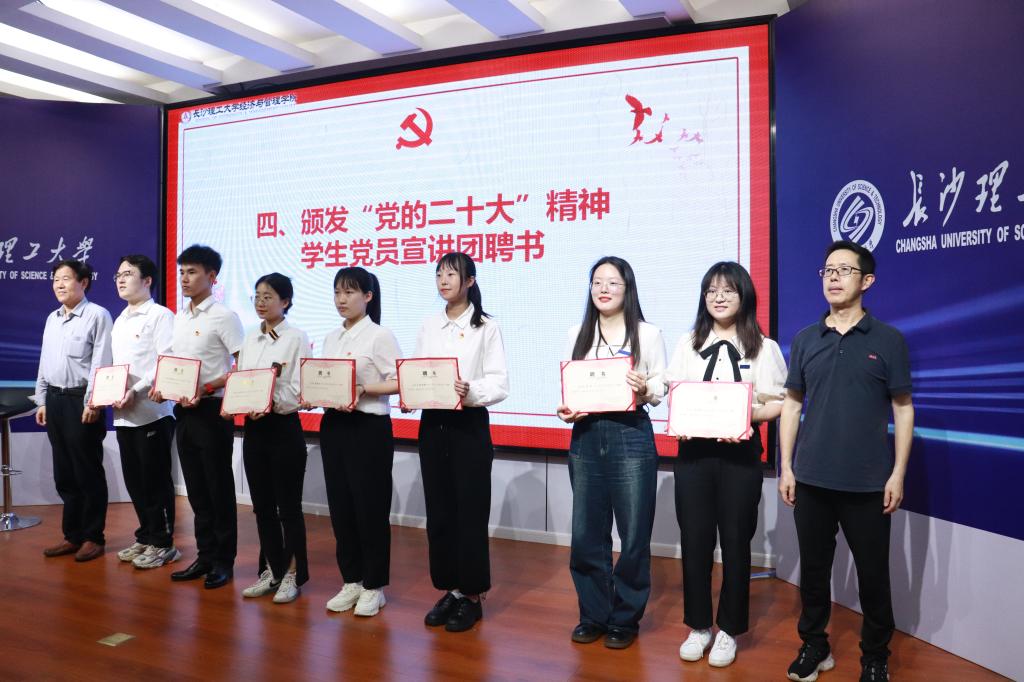 唐青宣读经管学院“青春践行二十大”主题教育活动方案。她指出,主题教育活动是学生思想教育与日常管理相融合的重要活动,要在广大学生中播撒下真善美的种子。她鼓励学生党员发挥党员的先锋模范作用,带动全体同学在丰富的主题教育活动中受锻炼、长本领。同步举行了“党的二十大精神学生宣讲团”聘任仪式,校关工委主任王乃厚和学院专职组织员丁力为学生宣讲团成员颁发聘书。