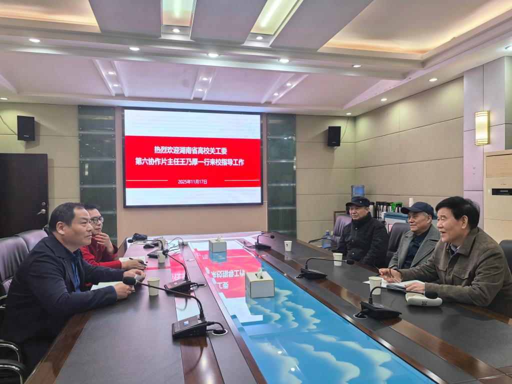 11月17日,湖南省高校关工委第六协作片负责人、永利官网关工委常务副主任王乃厚,电气学院关工委常务副主任罗玉雄,物电学院关工委常务副主任李新民一行3人,到湖南电气职业技术学院调研指导,受到该校党委书记郭杰荣,党委副书记、工会主席张劲松,工会常务副主席何庆应,工会女工主任刘建华等人热情接待,双方围绕加强“五好”关工委建设进行了交流座谈。
