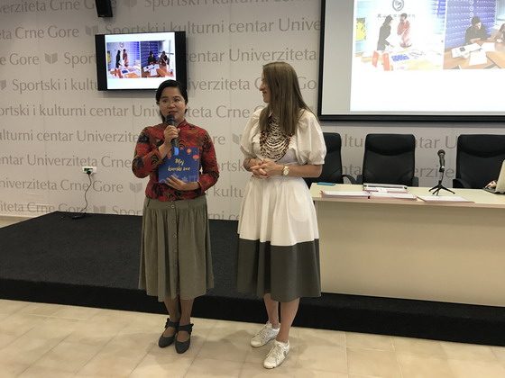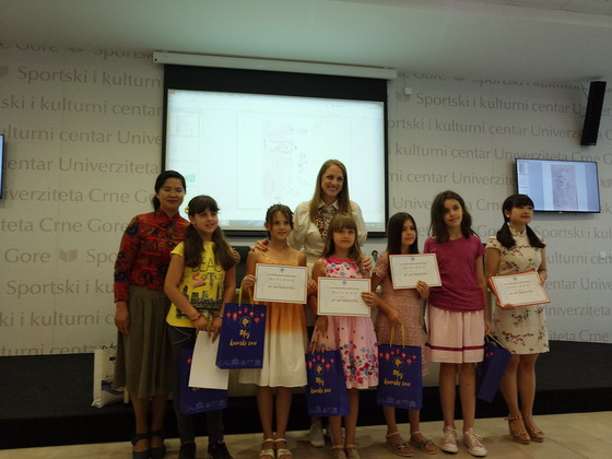当地时间2017年6月9日中午12:00,黑山大学孔子学院主题征文绘画比赛“我的中国梦”颁奖典礼在黑山大学体育会场中心隆重举办。黑大孔院外方院长米莱娜·久加诺维奇(Milena ·Ducanovic)、中方院长罗春霞、采蒂涅综合高中校长娜塔莎(Natasa),幼儿园教师代表玛雅(Maja)和米丽察(Milica),获奖学生及指导老师等出席了本次颁奖典礼。颁奖典礼现场座无虚席,气氛热烈,到场人数共300余名。