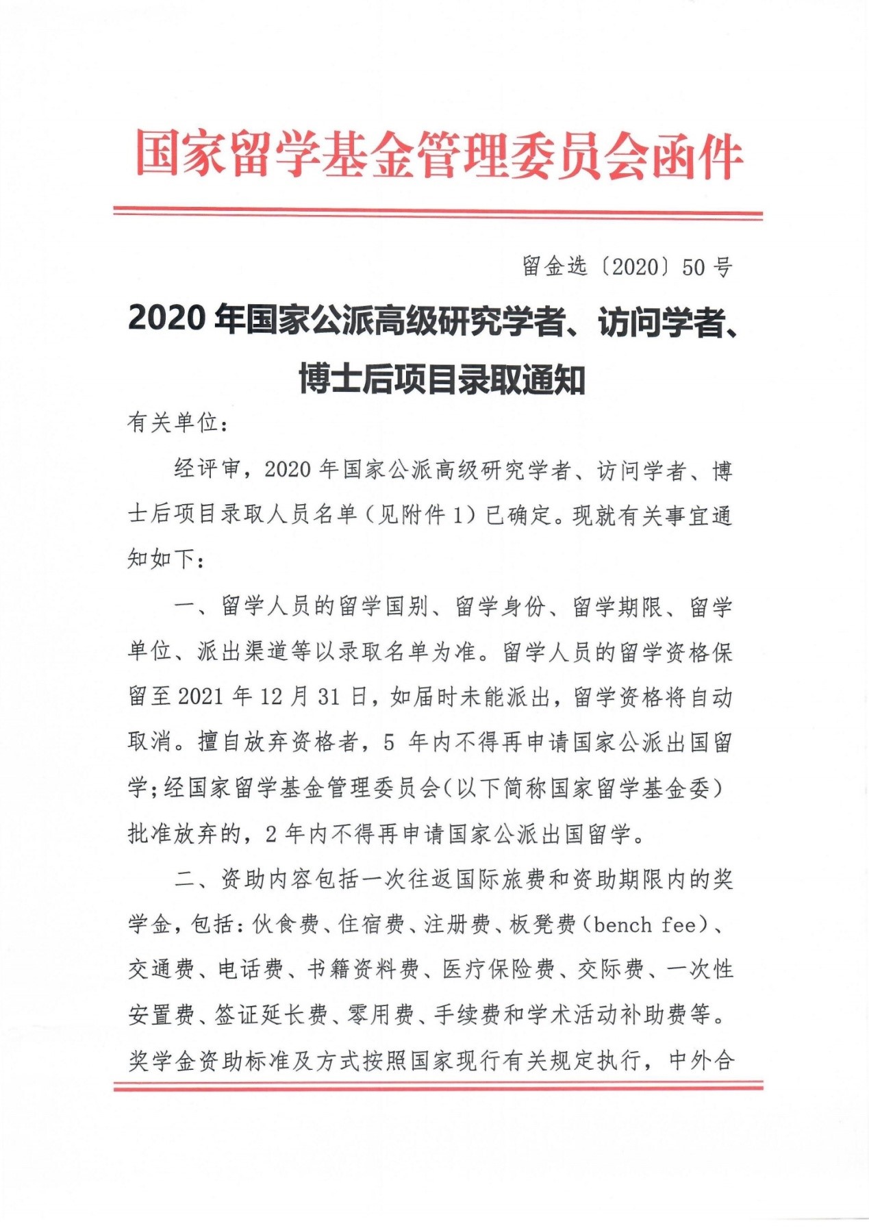 近日,国家留学基金管理委员会(以下简称“国家留基委”)公布了“2020年国家公派高级研究学者、访问学者、博士后项目(面上项目)”录取结果,根据国家留学基金委函件(留金选〔2020〕50号),永利官网巨锁基等14位申报该项目的老师全部被录取,录取率达100%(名单附后)。