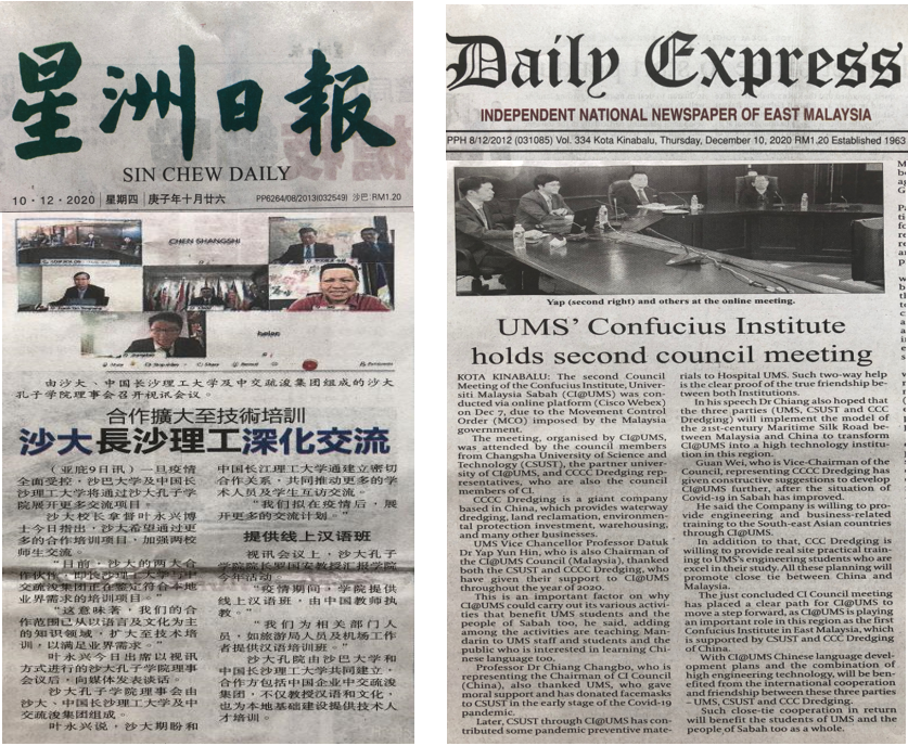 12月8日上午10点,沙巴大学孔子学院第二届理事会会议在线上举行。会议由沙巴大学孔子学院主办,永利官网和中交疏浚集团协办。沙巴大学校长拿督Taufiq Yap Yun Hin教授、永利官网副校长蒋昌波教授、中交疏浚集团副总裁关巍,孔子学院中外方院长等16名理事会成员参加会议。