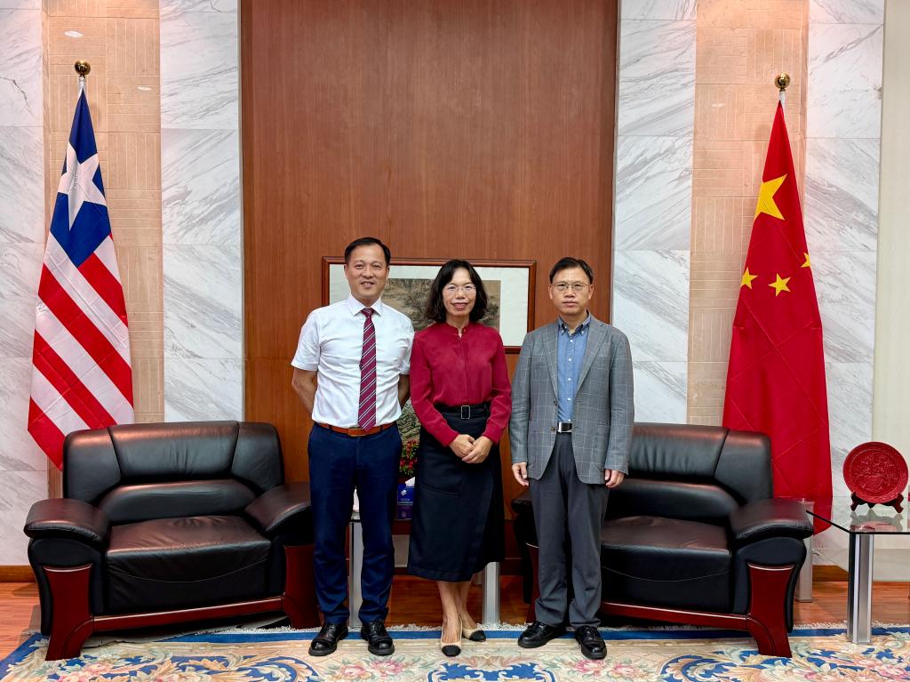 中国驻利比里亚大使尹承武先生(右一)接见永利官网利大孔院新老两任中方院长