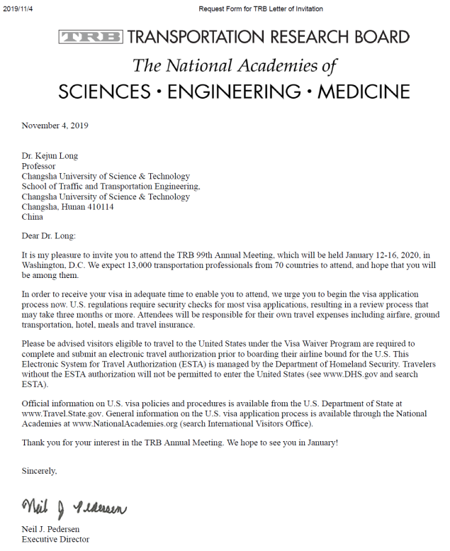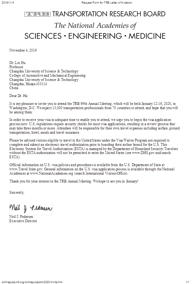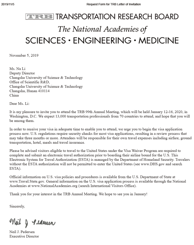 我非常高兴地邀请您和您的代表团在2020交通研究委员会年会后访问我们的办公室并交流你们的研究成果。我们对你们发表的关于高速公路和自动驾驶车辆的研究非常感兴趣,你们的访问对我们加州运输部来说将是一次很好的学习经历。你们的访问时间为2020年1月16日至1月19日。你们将自行负责此次访问的所有相关费用。您的代表团的成员名单在附件里。