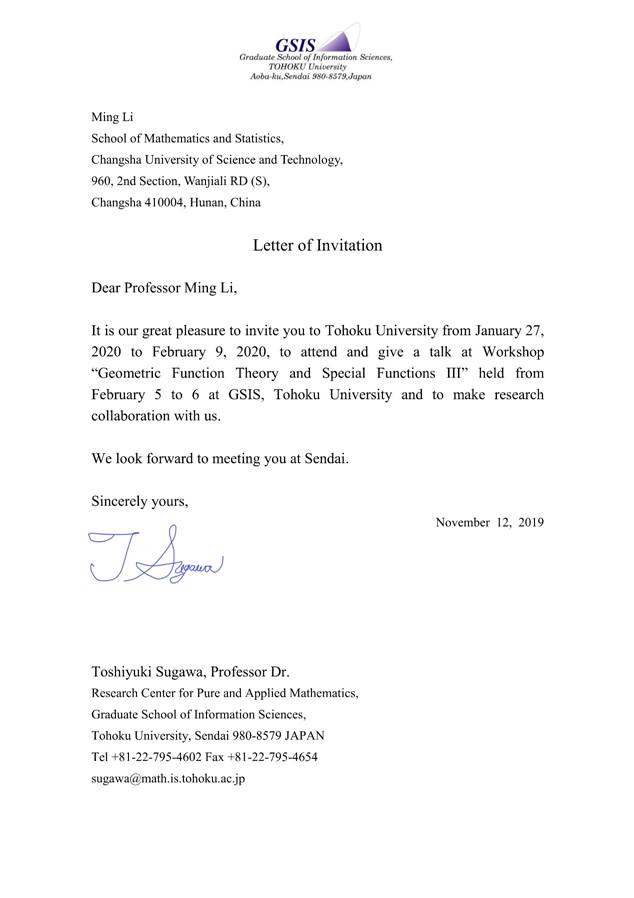 诚邀您于2020年1月27日至2020年2月9日到日本东北大学进行访问,就之前和之后的研究合作进行讨论。并诚挚邀请您在永利官网即将在2月5日至6日举办的“几何函数理论于特殊函数第三次会议”上做报告。