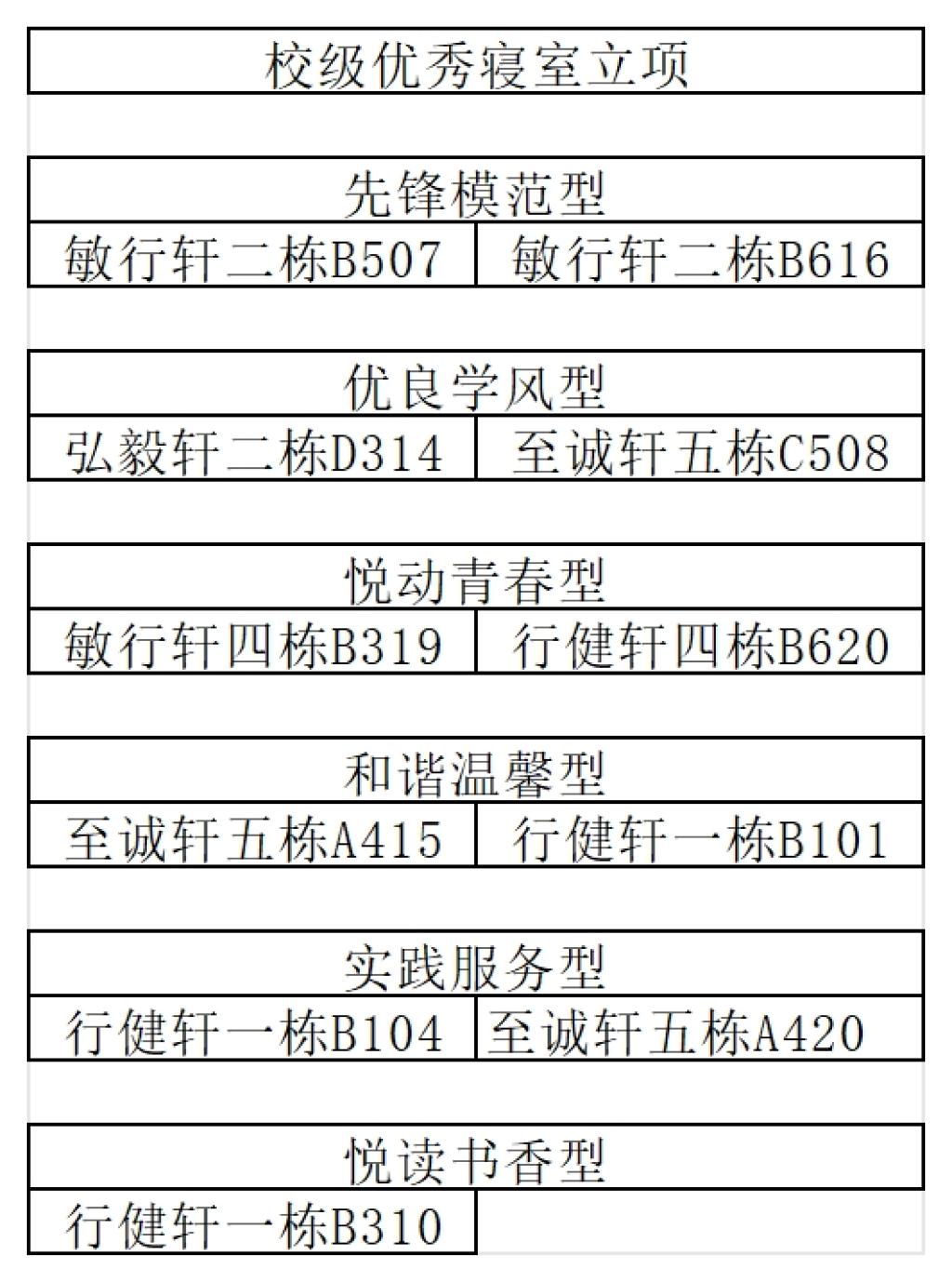 为深入推进“一站式”学生社区建设,营造安全、文明、和谐、温馨的公寓环境,根据学校《关于开展2025年“寓见风采”特色寝室创建的通知》要求,我院积极组织开展了2025年“寓见风采”特色寝室创建申报与院内遴选工作,现将校级优秀寝室立项公示如下: