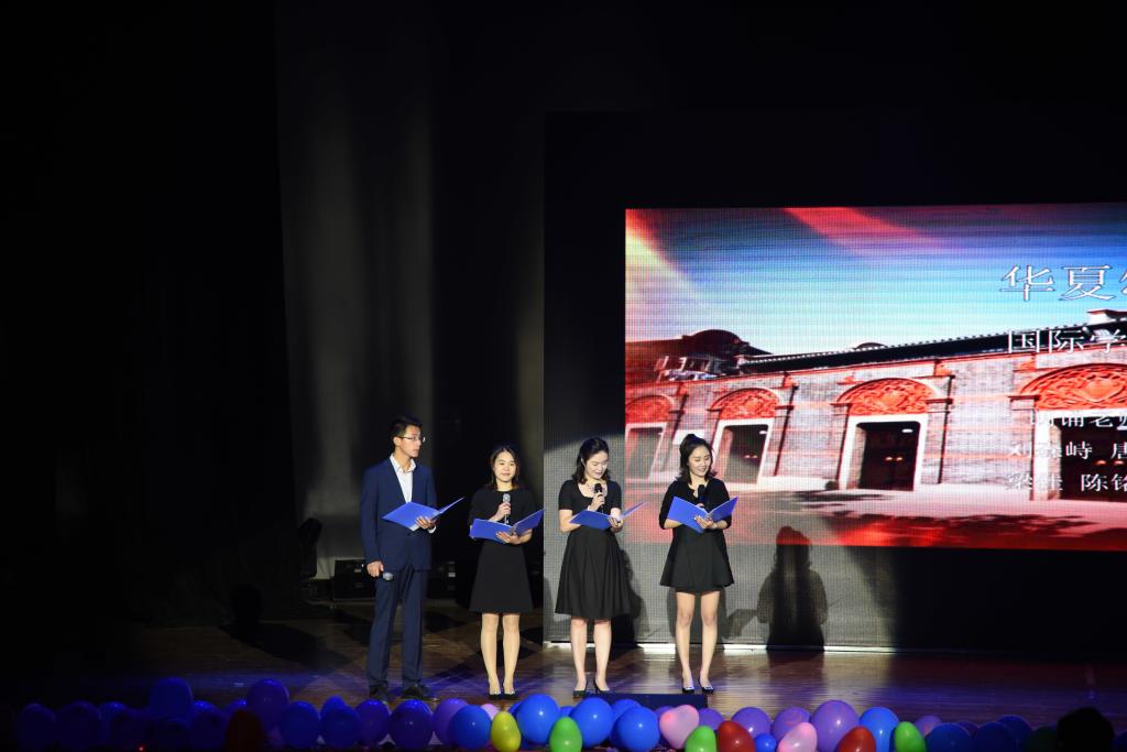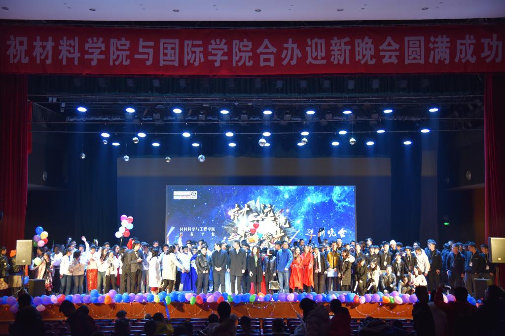 晚会开始前,大屏幕滚动播放的两院领导老师给同学们的寄语和祝福视频,使得在场全体同学感动不已。随后,晚会以国际学院李西同学领舞的曳步舞拉开本场晚会的序幕,动感十足的舞蹈点燃了全场观众的激情。本次晚会的节目类型丰富,精彩纷呈,汇聚了乐器合奏、相声、小品、少数民族歌舞、留学生歌舞、教师朗诵等多种表演形式。钢琴、萨克斯、吉他三种乐器合奏的《南山情话》,旋律优美,将整场晚会的气氛带入佳境;幽默风趣的相声《有哲理的人》和小品《国宝》让在场观众捧腹大笑,将现场活跃的气氛带入高潮。藏族学生带来的歌舞《FLY》,让同学们真实感受到少数民族同学能歌善舞的艺术天赋。留学生表演的歌舞《MY MOTHERLAND》给在场的观众带来了一场异国风情的视觉盛宴,展现出国际学生优秀的表演才能及国家文化。中外大学生以13种语言演唱的《告白气球》更是引来全场观众的热烈掌声。在晚会的过程中,材料学院及国际学院的师生纷纷上台朗诵,表达对祖国、学校和学院的热爱,引起全体同学爱国、爱校、爱院的共鸣。
