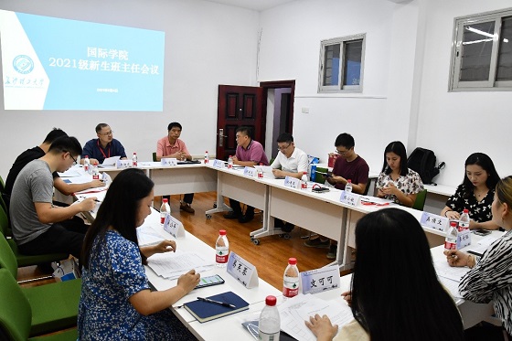 为加强班主任队伍建设,落实班级目标管理责任,更好实行国际学院学生培养计划,2021年9月4日17:00,2021级新生班主任工作会议于金盆岭校区办公大楼102召开。国际学院党总支书记刘安生,国际学院院长吴迪龙,国际学院党总支副书记兼副院长乔法光、国际学院新生辅导员易芙蓉和2021级新生班主任参加本次会议,本次会议由乔法光主持。