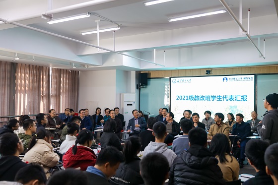 在师生现场交流环节,教改班学生围绕人才培养、专业认知、国际交流、能力培养等方面争先发言,曹一家校长一一予以解答,并要求相关部门进一步收集学生意见。近距离的交流与沟通令在场的学生们欢欣鼓舞,深受教育和感动。座谈会的气氛热烈融洽,搭建了学校与学生之间交流的桥梁,指引学生发展方向。