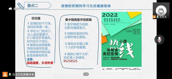 针对目前疫情防控的严峻形势,会议期间宣讲了防疫政策及相关法规和纪律,要求教改班学生深刻领会抗疫精神,绷紧思想之弦,要求学生坚决落实非必要不出门,不聚集,正确佩戴口罩,做好健康监测以及积极接种疫苗等,会议中分享了部分违纪案例,呼吁学生们做到四个“切勿”,同时对学生在校期间的学习生活给予建议,提醒大家积极关注疫情防控期间身心健康情况,再次强调了疫情期间心理疏导的重要性。
