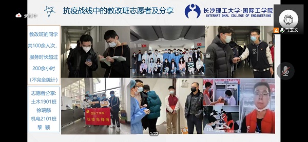 近期,共100多人次的教改班学生开展了超过200小时的志愿服务,在近期的核酸检测工作中驻守党员示范岗,服务校内核酸检测和日常数据整理等,发挥了模范先锋作用。本次线上会议以图片和表格的形式,公布了抗疫战线中的教改班志愿者的工作情况,土木教改1901班徐瑞麟与机电教改2021班黎颖作为志愿者代表发言,分享了志愿活动的所见所感,表达了对医护人员和全体师生志愿者们的崇高敬意。