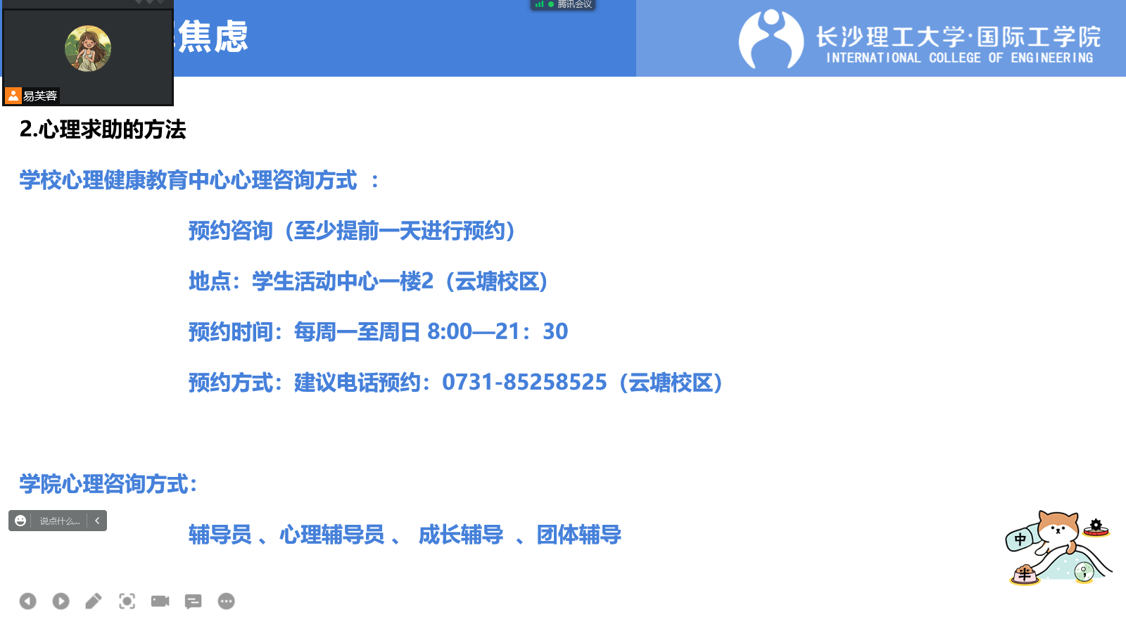 9月1日,国际工学院在腾讯会议平台召开了2019级学生团体成长辅导大会,毕业年级辅导员马玉文、心理辅导员易芙蓉,2019级全体毕业生参会。