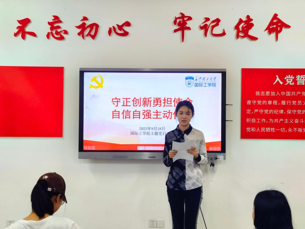 9月18号晚,国际工学院学生第一、二党支部围绕“守正创新勇担使命,自信自强主动作为”主题,分别在新能源大楼一栋424和402报告厅开展主题党日活动。