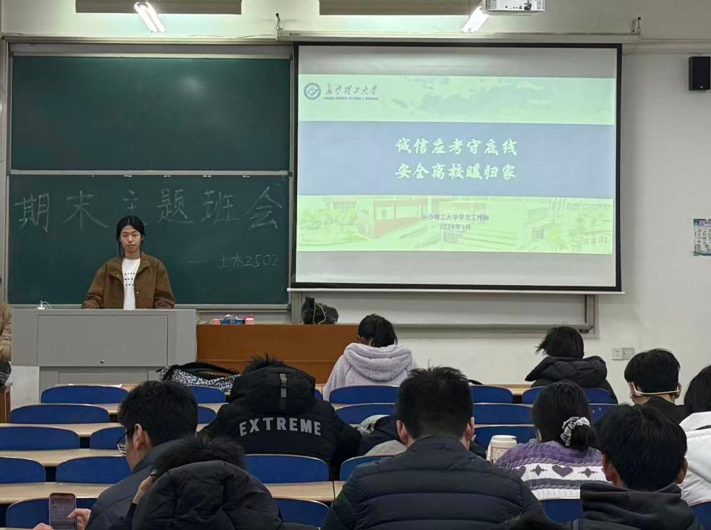 本次班会的核心内容为考风考纪和诚信应考教育、期末安全教育、期末人文关怀与精准帮扶共三个方面。各班级组织学生系统地学习了《304永利集团官网入口学生考试违规处理办法》等文件,结合典型案例剖析违规后果并以班级为单位完成了《诚信考试承诺书》签署;围绕消防、反诈、校园交通等安全要点,通过视频学习、案例讲解开展专题教育,明确离校报备流程与返乡安全要求;同时班长针对学业压力、经济困难等问题讲解了心理健康支持渠道与特困补助申请方式。