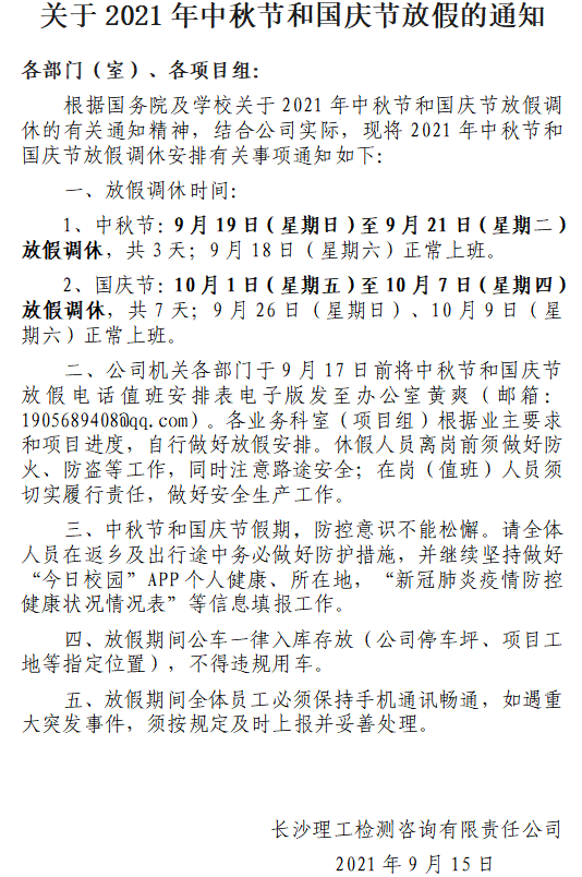 上一条:长沙理工检测咨询有限责任公司2024年度职工健康体检项目询价公告 下一条:关于2021年端午节放假的通知