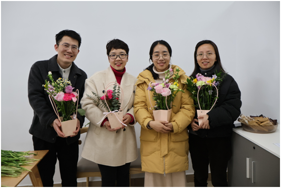 活动现场,提前备好的玫瑰、康乃馨、小雏菊、香雪兰、风铃花、紫罗兰等各色鲜花,连同花器、剪刀、花泥等工具整齐摆放,沁人心脾的花香弥漫其间,现场暖意融融、氛围浓厚。老师们有序领取花材,怀着对美好事物的热爱,缓缓开启了自主插花创作之旅。