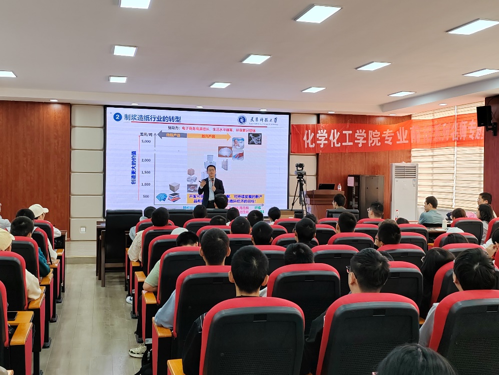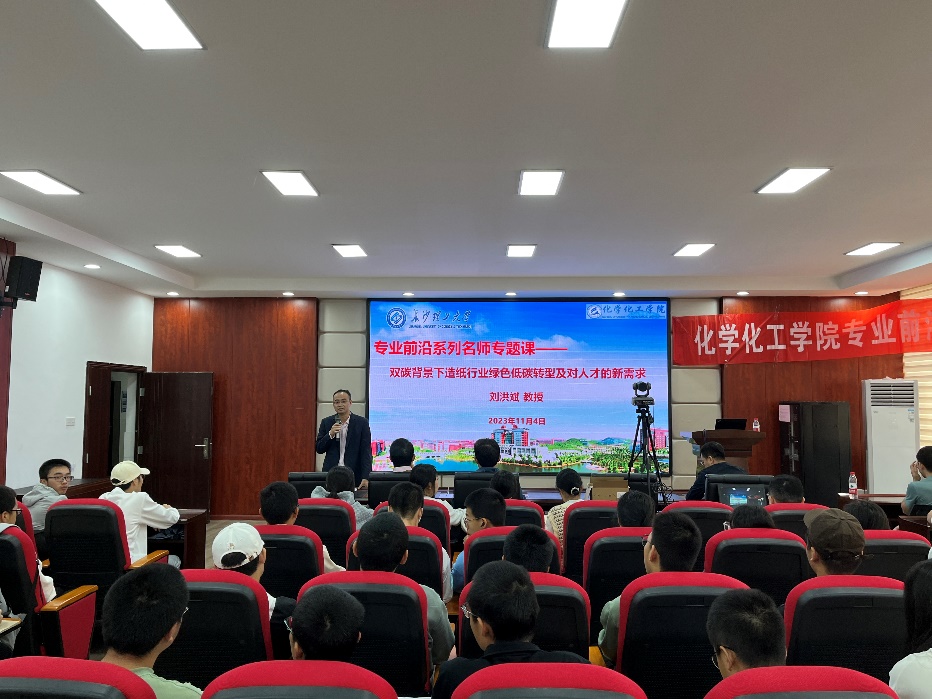 2023年11月4日,化学化工学院专业前沿系列名师专题课程第五讲在工三A320举行,特邀嘉宾为天津科技大学轻工科学与工程学院院长、天津市高等学校“学科领军人才”、博士生导师刘洪斌教授,讲座题目为“双碳背景下造纸行业绿色低碳转型及对人才的新需求”。讲座由化学化工学院副院长陈启杰教授主持,学院部分教师和学生共计120余人参加了本次专题课。