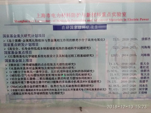 2018年12月13日下午,调研又赶到上海电力大学环境与化学工程学院的杨浦校区实验室,该校区主要是科研实验设备,图7~图8是环境与化学工程学院的科研成果及项目情况照片。