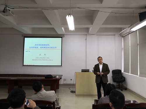 11月8日上午,国家杰出青年科学基金获得者、教育部“长江学者”特聘教授、兰州大学功能有机分子化学国家重点实验室主任王为教授应邀来永利官网进行学术交流。在云塘校区工科三号楼A320会议室,王为教授以“共价有机框架材料:从共价组装、结构表征到功能应用”为题,给大家带来了一场学术盛宴。学术报告会由化学与生物工程学院院长杨荣华教授主持,副院长曹忠教授、副院长朱志平教授、副院长张跃飞教授及化学、化工、食品等相关学科的老师、研究生及本科生100余人参加了学术报告会。