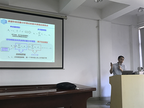 陈教授针对传统波谱分析理论中波谱校正模型和方法不适用于非均相复杂体系定量分析这一难题,基于化学计量学方法,从建立乘子效应模型、发展校正样本光谱乘子参数的估计方法运用双校正策略预测溶液相和固相中组分含量等多方面系统构建了波谱形变定量分析新理论,开发了便捷通用的化学软件,并将这一新理论成功应用于实际生物传感应用中。陈教授深入浅出的讲解令聆听报告的师生们受益匪浅。