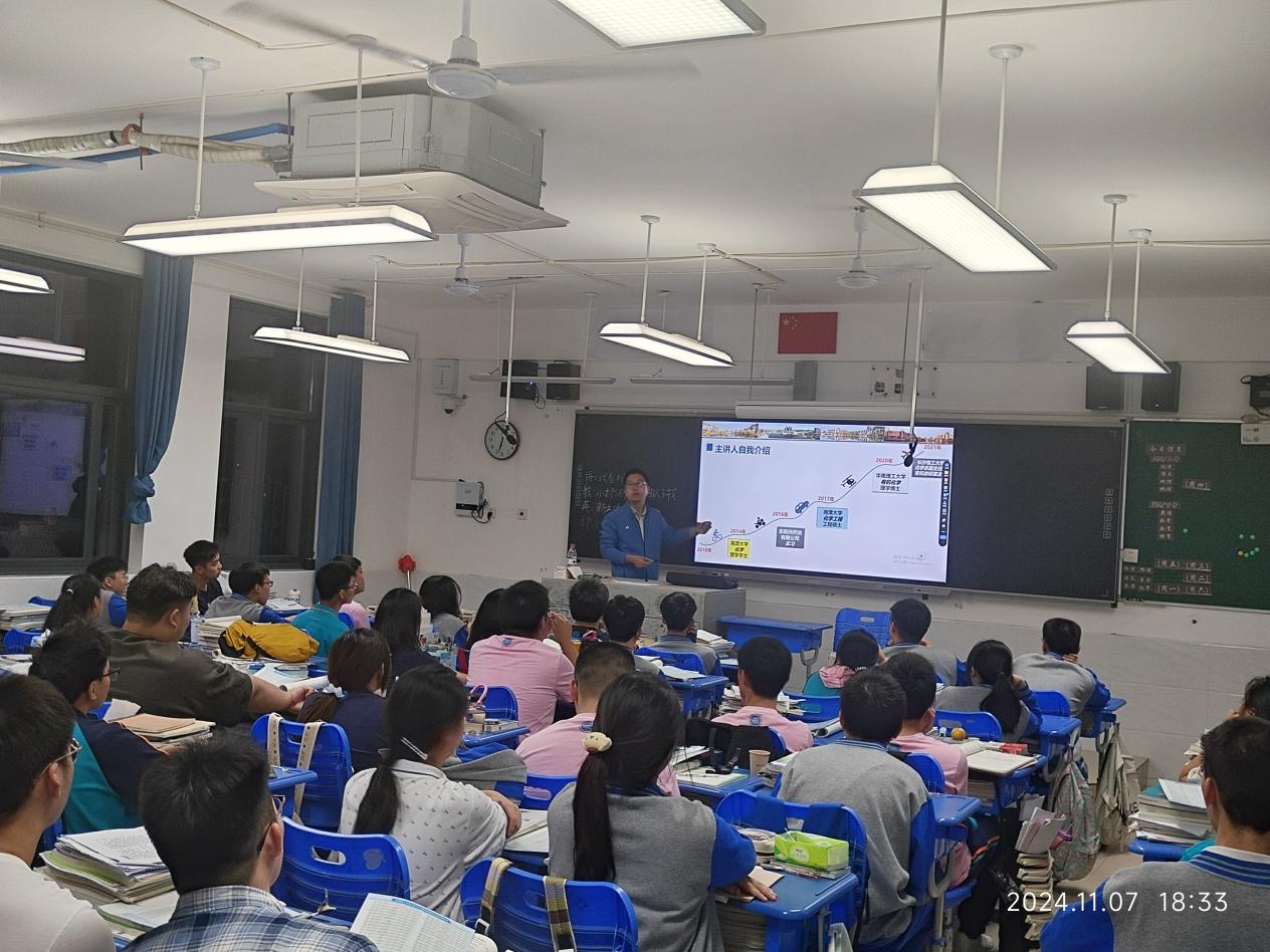 在活动中,化学化工学院的罗文坤博士为弘益中学的高三学生进行了主题为“化学生物学领域发展情况”的专题讲座。罗文坤深入浅出地介绍了化学生物学作为交叉学科的最新研究成果及发展趋势,讲解了该领域在现代医学、环境保护、能源利用等多个方面的重要应用,激发了同学们对化学与生物学结合的浓厚兴趣。讲座内容不仅涵盖了化学生物学的基础知识,还强调了该学科对未来社会发展的积极影响,展现了化学化工专业的广阔前景。