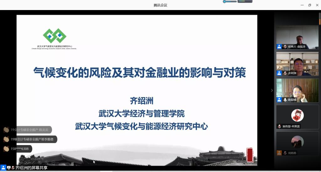 齐绍洲教授主讲“气候变化的风险及其对金融业的影响和对策”。他从物理风险和转型风险两个层面分析了气候变化所带来的风险,在此基础上专门分析了气候变化对金融业的影响,提出了金融业应对风险气候风险的思维模型。