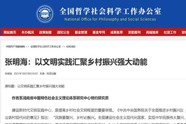 近日,全国哲学社会科学规划办公室门户网站“社科动态”栏目全文转载推介永利官网马克思主义学院张明海教授的研究成果《以文明实践汇聚乡村振兴强大动能》。该成果2021年10月18日发表于《经济日报》,系张明海教授主持的国家社科基金重大招标项目“深化拓展新时代文明实践中心建设方法与路径研究”的阶段性成果。