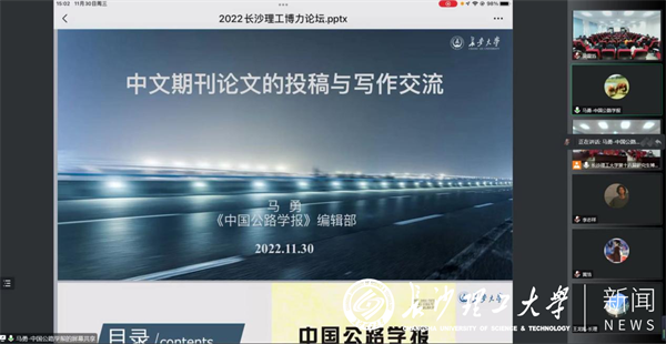 《中国公路学报》的编辑部主任马勇作题为《中文期刊论文的投稿与写作交流》的报告,分享了中文期刊投稿经验体会,给研究生在投稿中文期刊的时候提供了极大的帮助。