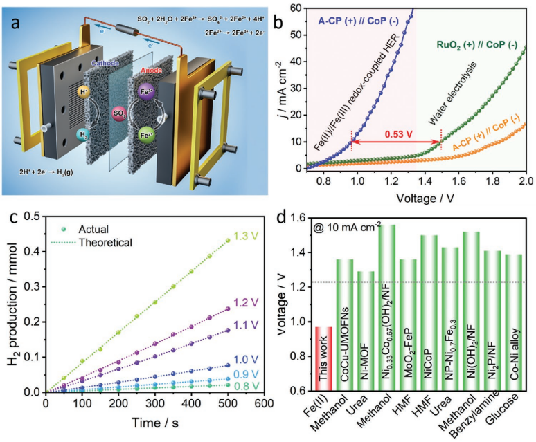 氢能由于具有高的能量密度及零碳排放等优点,已发展为先进能源领域的重要方向,成为基础研究和产业开发的焦点。电催化水分解在绿氢制备工艺中起着核心作用,对氢能的发展具有重要意义。在电解水过程中,OER是整个反应的速率控制步骤,也是关键的能耗反应,极大地限制了整体电催化反应速率。同时,阳极产生的氧气价值相对较低,有可能与阴极产生的氢气混合,造成安全隐患。因此,为了实现高效的电催化转化制氢,研究具有低电位和高附加价值的阳极OER替代反应是非常重要的。基于前期葡萄糖辅助Cu(I)/Cu(II)氧化还原与HER耦合制氢体系的研究工作基础(Y. Zhang, et al. Adv. Mater. 2021, 33, 2104791.),张怡琼副教授团队提出了一种基于低成本催化剂材料同时实现制氢和二氧化硫(SO2)废气捕获的节能环保策略,在阳极侧利用SO2废气来辅助Fe(II)/Fe(III)发生变价金属的氧化还原反应,将Fe(II)/Fe(III)电氧化反应取代阳极传统的OER,降低阳极氧化电位,耦合阴极析氢反应,构建了低电压高效制氢体系。通过综合安全、低成本、高附加值、设备要求简单等优点,该体系有望与燃料电池系统结合,为发展低能耗、高经济和环境友好的低碳制氢-燃料电池系统提供了新的思路。