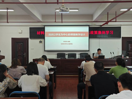 919下午三点,材料学院在新能源1号大楼302会议室开展本科教育教学审核评估专题学习会,主讲人为学院教学副院长李灵均,全体教职工参会学习
