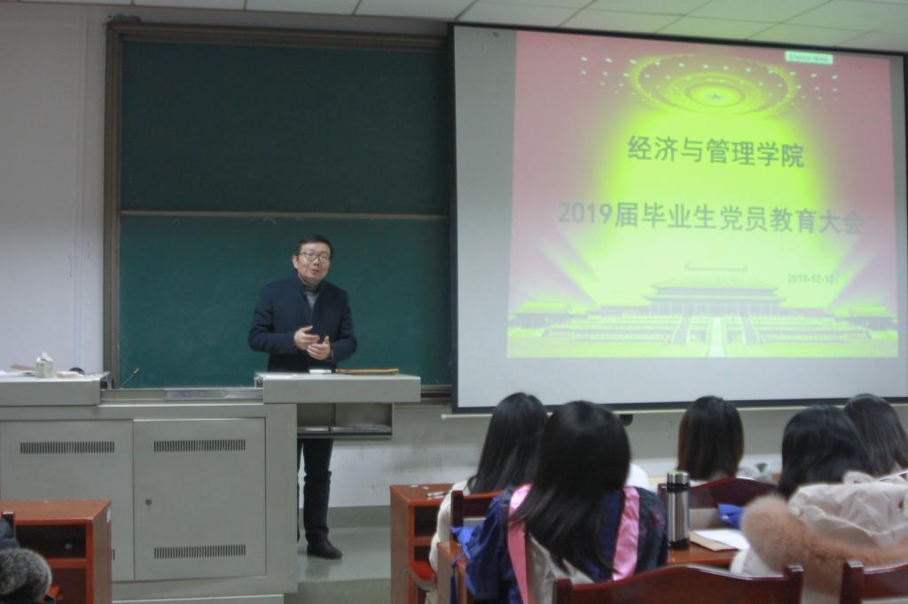 2018年12月12日下午,经管学院在金盆岭校区7教110室举行了2019届研究生毕业生党员教育大会。会议由辅导员庄奕主持,学院党委副书记涂道勇,学生党建辅导员王宝宝及2019届全体研究生毕业生党员参加。