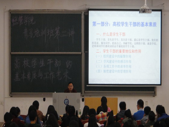 本次培训的主题为“高校学生干部的基本素质与工作艺术”,唐书记首先解释了“学生干部”的内涵、重要地位及作用,并根据自己多年的工作经验,强调学生干部应做到服务同学、提高自己、奉献学院,要发挥组织建设中的凝聚作用、学风建设中的感召作用、各项工作中的表率作用、制度建设中的管理作用,做到诚心诚意对待每位成员,将带头作用体现在实处。接着,唐书记从三个方面介绍了学生干部的基本素质,即:树立现代公民意识、学会培养创新心态、培养良好的综合业务素质。对此,唐书记再次强调学生干部应树立“领袖目标”,要求同学们不仅要有想法,更要有做法,不断提高自己的文化素养和思想觉悟,同时培养社会责任感。最后,唐书记详细阐述了如何平衡工作与学习,明确要求不可因工作的事情而耽误学习,要求同学们要合理、科学地安排时间,要以坚定的恒心和毅力刻苦钻研、不断学习、发挥“钉子”精神以不断提高组织管理、动手操作、分析问题、解决问题、人际协调等能力。